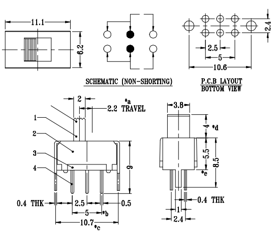 The 2P2T Slide Switches adouble-pole double-throw (2Pole 2Throw) control switch that enables two-state switching for two independent circuits (e.g., on/off, mode selection) via a rocking operation, ideal for scenarios requiring synchronized control of dual circuits.